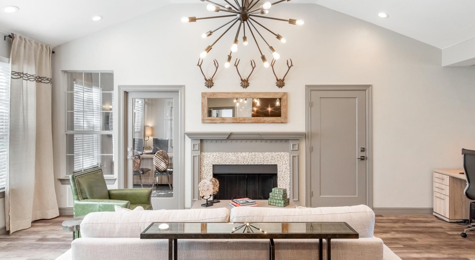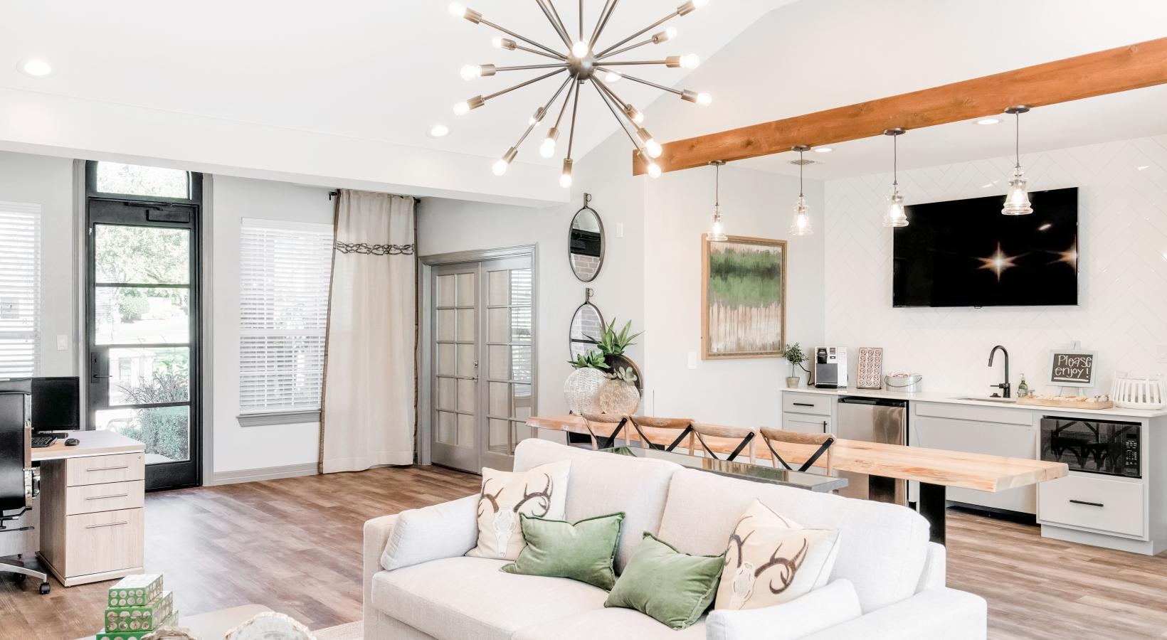 • a clubroom with a white couch and a chandelier