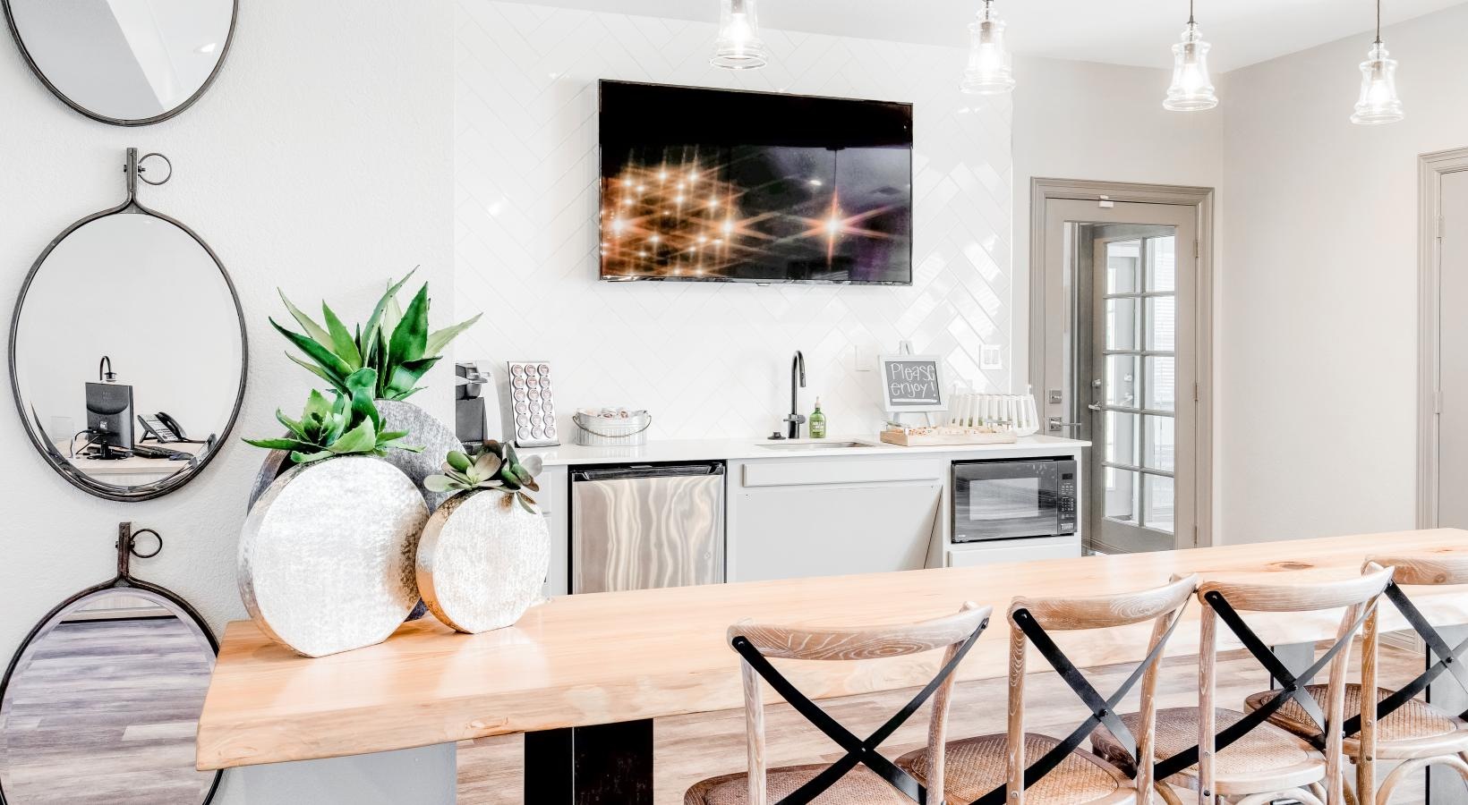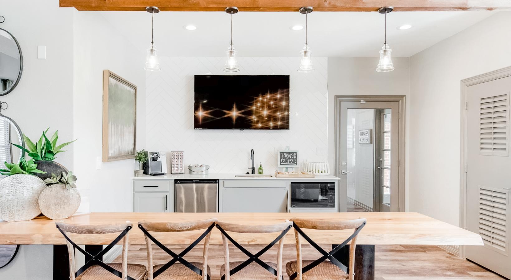 • a community kitchen with a dining table