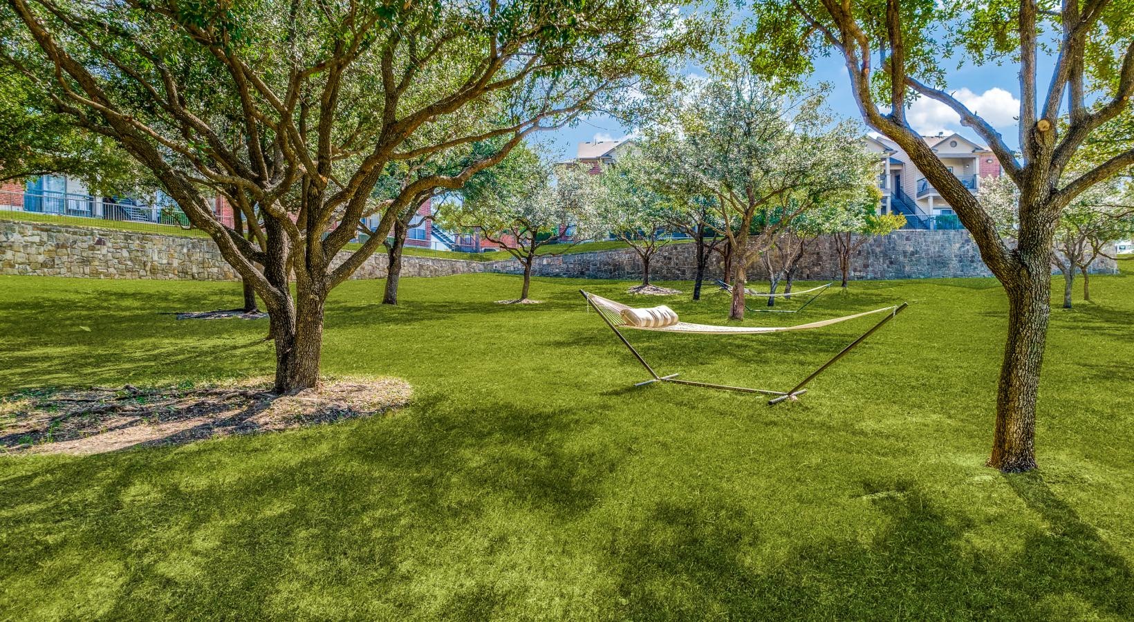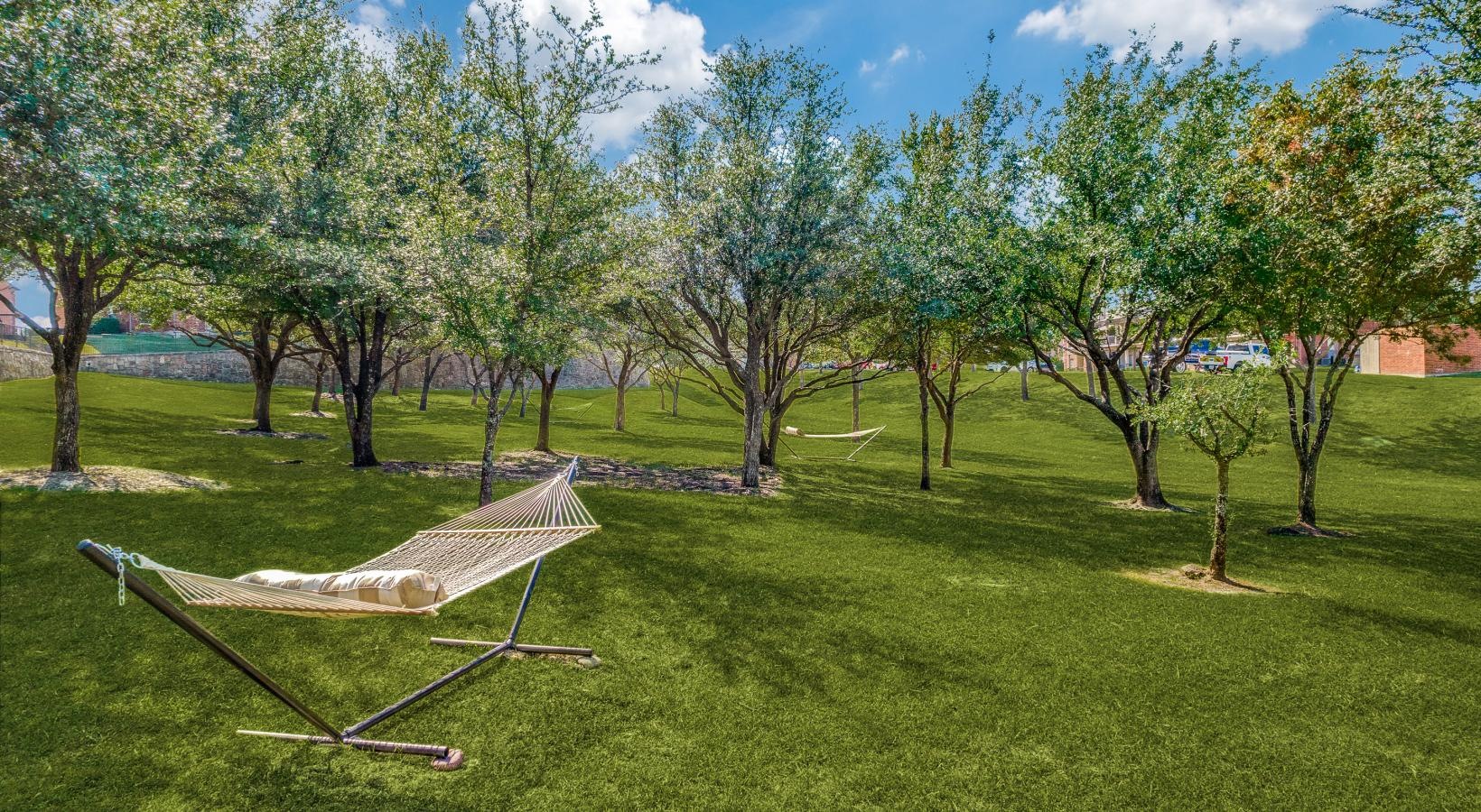 • a lawn with trees and hammocks