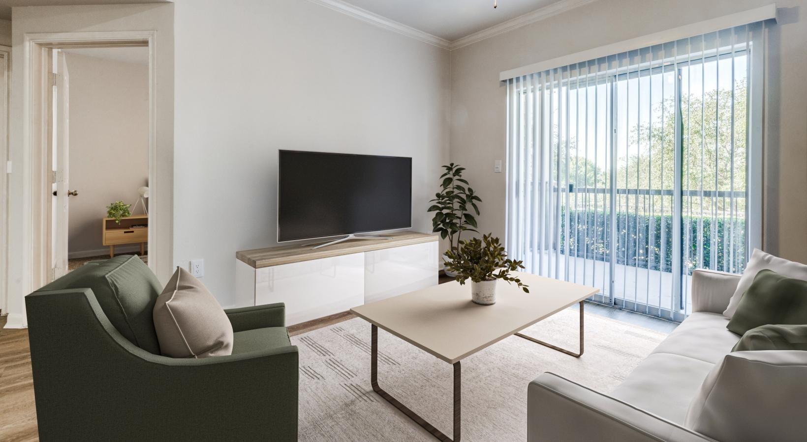 • a living room with a tv, a couch and a chair